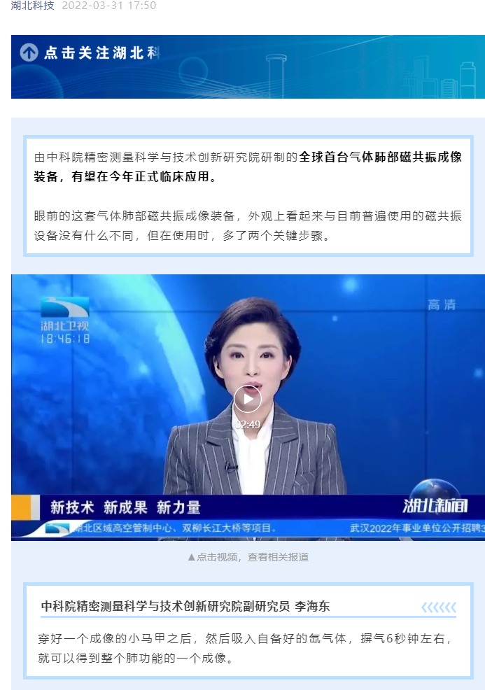 【湖北卫视】聚焦 | 新技术、新成果、新力量!全球首台气体肺部磁共振成像装备将在今年临床应用