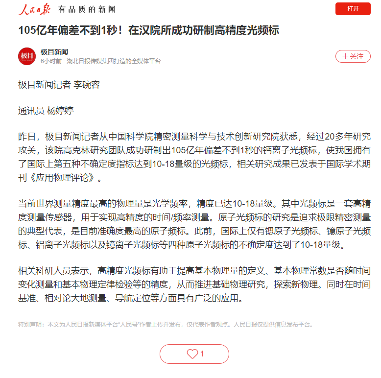 【人民日报】105亿年偏差不到1秒!在汉院所成功研制高精度光频标