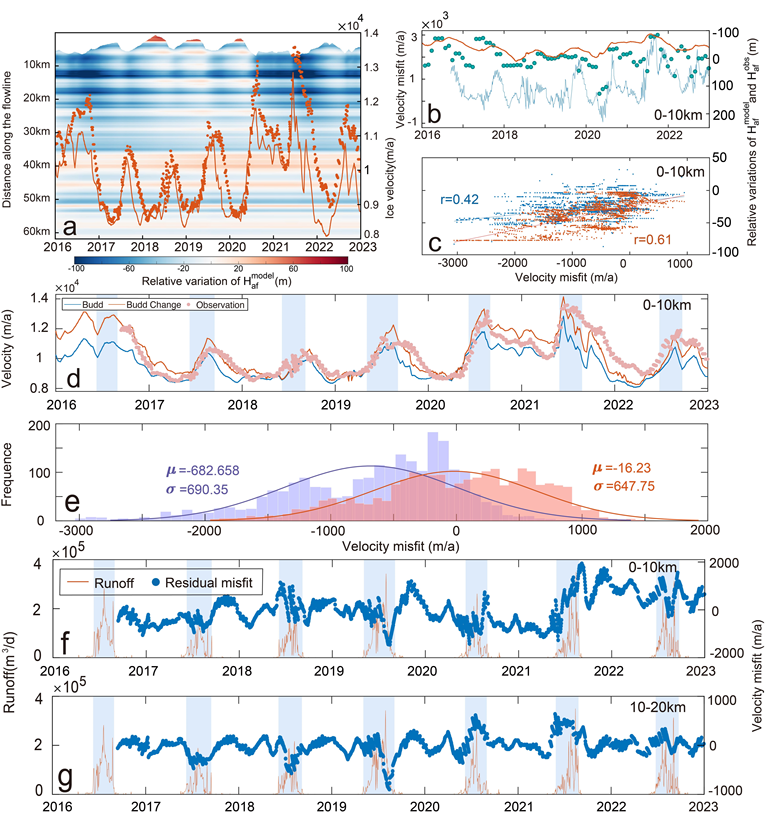 研究发现,当以观测的亚月度冰川末端位置作为强迫条件时,模型可再现约76%的流速变化。在冰川末端0-10公里范围内,模型化与观测流速的误差与“浮力以上高度”(Haf)的变化显著相关。Haf 作为有效压力变化的代理变量,纳入模型后可解释冰川末端0-10公里范围内90%以上的误差。模型考虑瞬态基底摩擦变化和冰厚引起的有效压力变化后,地表径流变化与流速残差误差的峰值一致,表明地表融化对冰流速的短期影响低于10%。研究表明,Jakobshavn Isbræ冰川的流速变化主要受末端位置变化的驱动,但冰厚变化和冰下水文过程引起的有效压力及基底条件的季节性变化也对其年际和季节性加速有显著影响。随着冰川向更深盆地退缩,其对季节性有效压力变化的敏感性将持续存在。该研究首次系统量化了末端退缩、冰厚变化及水文过程对格陵兰冰川动力学的影响,并强调了在数值模型中准确参数化冰下有效压力的重要性。研究成果将提升格陵兰冰盖未来演化的预测精度,为全球海平面上升评估给予更可靠的科学依据。