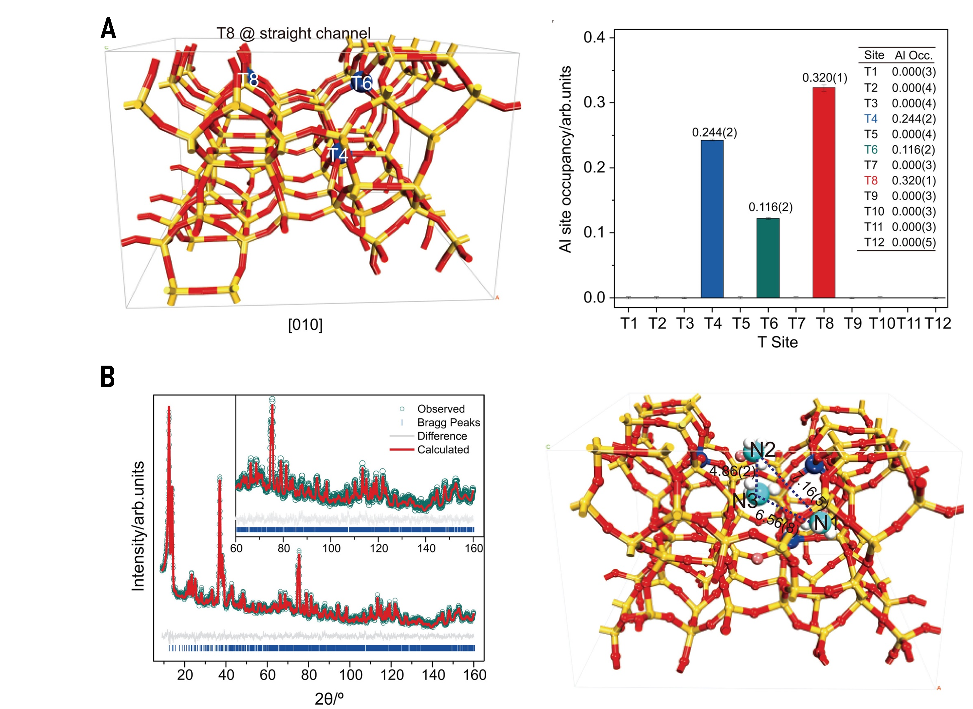 (A)利用同步辐射X射线衍射解析Al原子在H-ZSM-5沸石分子筛中占据的T位;
