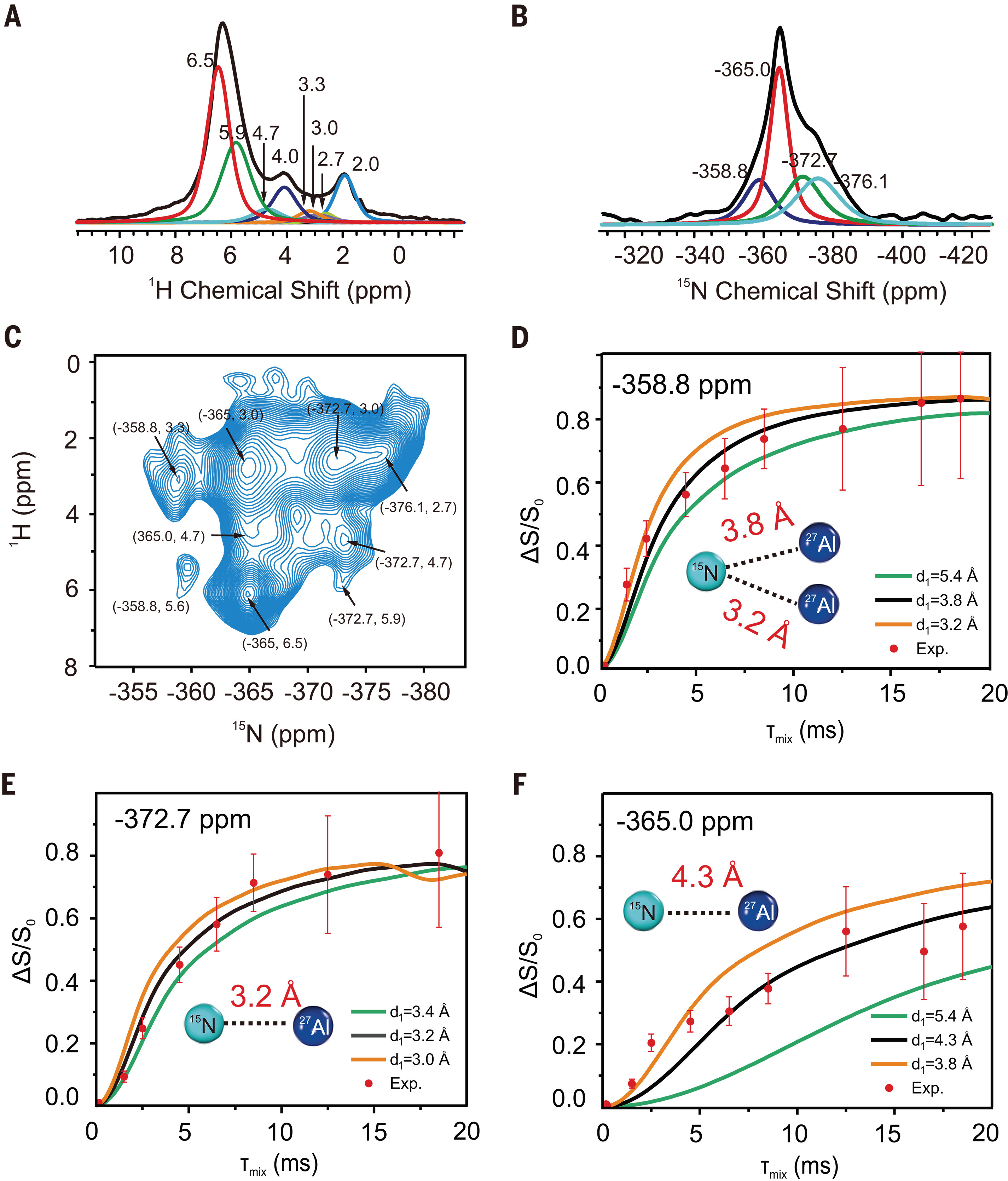 沸石分子筛中Al原子的落位与分布受复杂的合成条件影响,难以单独顺利获得X射线吸收谱、固体核磁共振、原子探针断层扫描等技术准确确定,限制了对沸石分子筛构效关系的深入研究。为此,曾适之教授团队顺利获得同步辐射X射线衍射方法,选择Al元素吸收边以区分Si、Al原子,结合结构精修,明确了H-ZSM-5沸石分子筛中Al原子主要分布于T4、T6和T8位点;进一步,利用小尺寸碱性分子氨作为探针捕获活性中心的酸性质子,结合粉末中子衍射和结构精修,发现与T8孤立Al位点不同,氨分子会同时吸附于T4和T6两个Al位点。邓风研究团队对H-ZSM-5沸石分子筛中氨分子的吸附位点进行了固体NMR研究,利用一维15N及二维1H-15N异核相关固体NMR技术,明确了H-ZSM-5沸石分子筛中来自硅羟基的弱吸附(-376.1 ppm)和来自酸性位点的强吸附(-372.7、-365.0、-358.8 ppm)两类氨分子吸附的15N信号;进一步顺利获得15N{27Al}双共振固体NMR技术测量了强吸附位点上15N、27Al自旋系统的原子间距离。结合中子衍射实验结果,发现位于-358.8 ppm的氨分子上的15N原子可同时与两个27Al原子空间临近,其余两个15N信号来自于与孤立27Al原子空间临近的15N原子。固体NMR实验测量的核间距离与粉末中子衍射的结果一致,证明H-ZSM-5沸石分子筛具有T8孤立Al位点和T4、T6双Al位点的活性中心。值得注意的是基于中子粉末衍射-同步辐射X射线衍射-固体核磁共振的联合技术同样适用于其它不同类型分子筛活性中心的表征。