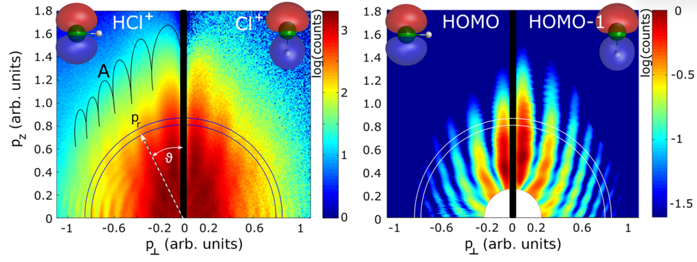 来自异核分子 HCl不同分子轨道(HOMO 与 HOMO-1)的光电子全息图案;左为实验测量结果,右为理论模拟结果