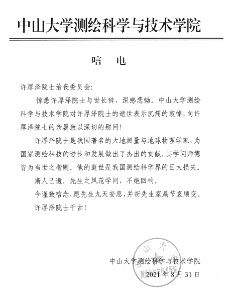中山大学测绘科学与技术研究院唁电